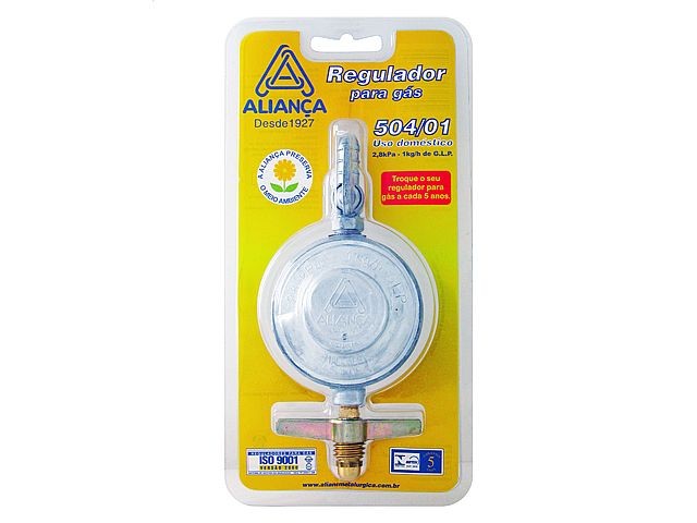Para ligar o seu fogão ao botijão de gás com segurança, você vai precisar do Regulador para Gás 504/01 da Aliança. Este modelo foi projetado para utilização do G.L.P em botijões com consumo de até 1kg por hora de gás e com pressão nominal de saída de 2,8kPa (baixa pressão).