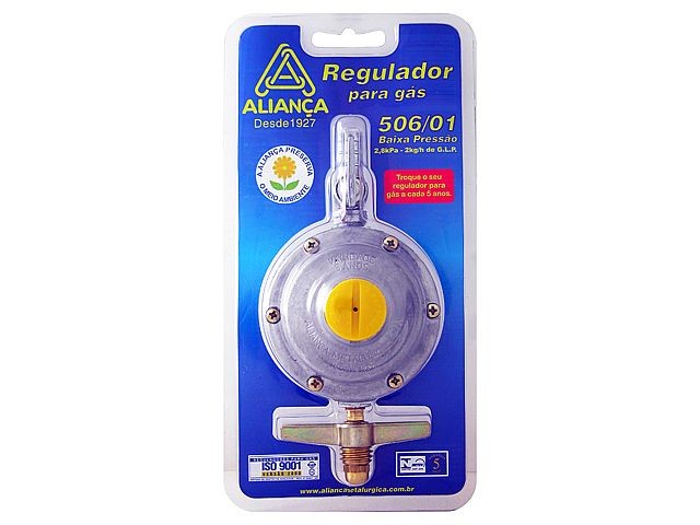 Para você obter um melhor desempenho do seu fogão, seja doméstico ou industrial, você vai precisar do Regulador para Gás 506/01 da Aliança, para ligar o seu fogão ao botijão de gás com toda a segurança necessária. Este modelo foi projetado para utilização do G.L.P em instalações com consumo de até 2kg por hora de gás e com pressão nominal de saída de 2,8kPa (baixa pressão).