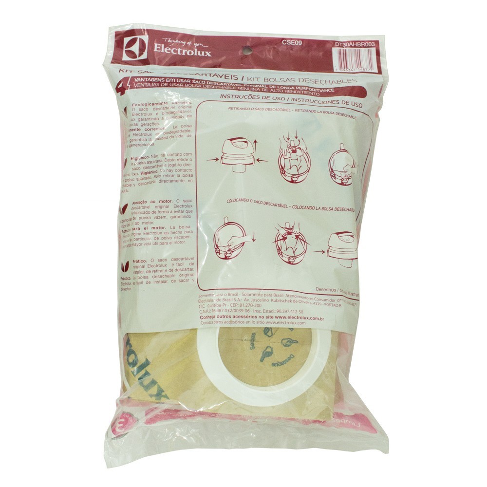 Os sacos descartáveis Electrolux são biodegradáveis e não agridem o ambiente. São higiênicos e desenvolvidos com 2 níveis de filtragem, que evita que a poeira escape e danifique o motor. Fácil de instalar e de descartar, é o único que garante a qualidade Electrolux na sua casa.
