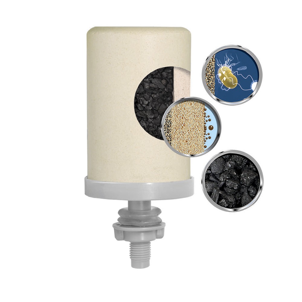 A Vela tripla ação, declorante e esterilizante, possui revestimento de prata coloidal, aplicado na parte interna da vela, junto com o carvão ativado. Eles trabalham para filtrar e reduzir odores, sabores e o teor de cloro, além de reduzir a presença de bactérias da água. A camada de prata aplicada internamente penetra pelos poros da vela, preservando sua propriedade esterilizante.